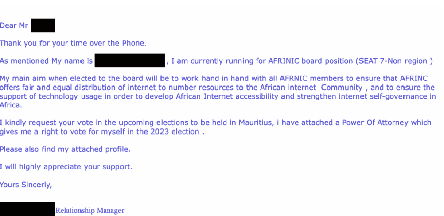 This is to alert AFRINIC Resource Members of a misleading email communication from purported representatives of a fictitious organization; targeted at AFRINIC Resource Members (“members”), soliciting them to sign a power of attorney form and surrender their MyAFRINIC portal credentials with them for the purpose of casting a vote for Board Member’s seat. Here is an example of such an email.