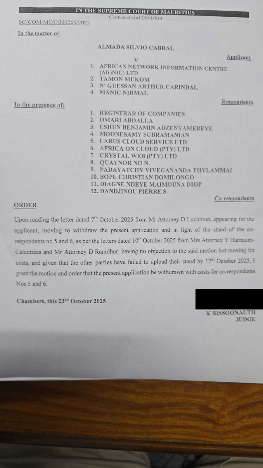| 80 | 29 August 2025 | TISPA vs AFRINIC & Anor [SC/COM/WRT/000657/2025] | Application for an injunction preventing the Receiver from conducting the Board election pending determination of the application for the appointment of a Joint Receiver. Application declined and matter fixed for Physical Appearance on 02 Sept 2025 (See Attached) |