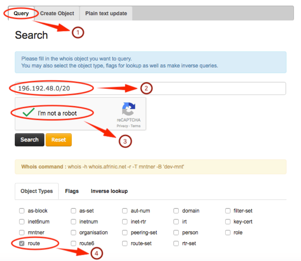 Note: To get the route object template, go to the AFRINIC web whois interface (http://whois.afrinic.net), click on Create Object, select ‘route’ and click on Load;